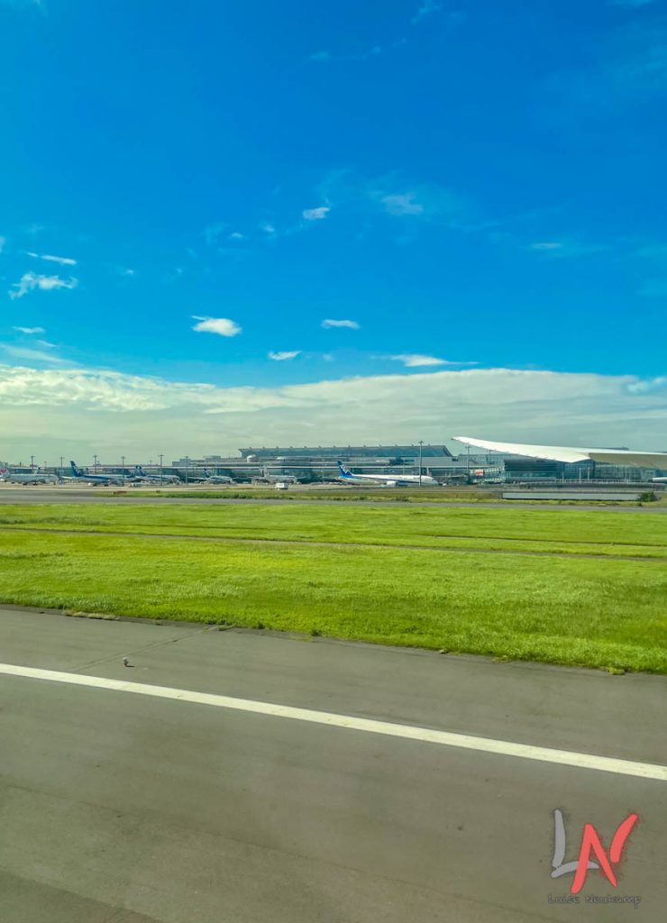 Irgend­wann war es dann aber soweit und unser Flieger lan­dete am Hane­da Flughafen. Der Lan­dean­flug über das Meer war sehr cool! Ich saß auf der linken Seite des Flugzeuges und hat­te eine tolle Aus­sicht. Nach Ankun­ft am Gate wur­den im Flieger erst ein­mal Masken verteilt, weil in Japan am Flughafen Maskenpflicht herrscht.